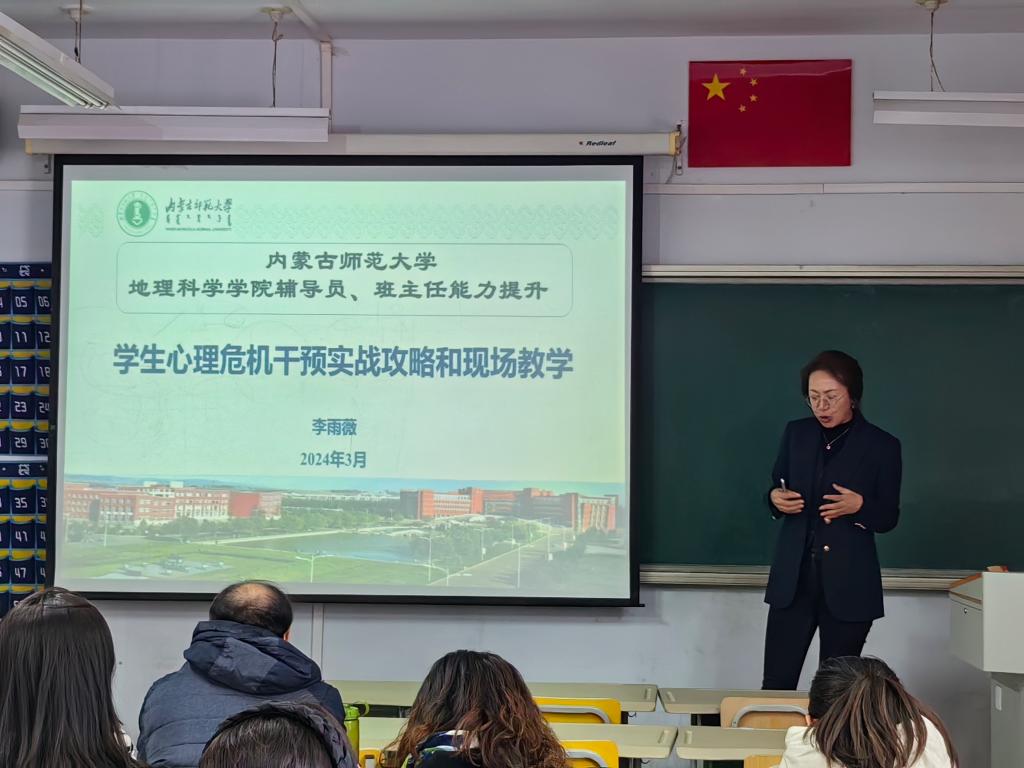 为全面落实教育部等多部门联合发布的《全面加强和改进新时代学生心理健康工作专项行动计划(2023—2025年)》,提高辅导员、班主任对学生心理危机的识别和干预意识,提升学院学生心理危机干预工作水平,完善心理危机干预,健全预警体系,优化协作机制,创建平安校园,3月7日下午14:30,BB贝博艾弗森原官方网站组织全体班主任、专职辅导员等40余人在赛罕校区田楼122举办了“BB贝博艾弗森原官方网站辅导员、班主任能力提升——学生心理危机干预实战攻略和现场教学”培训班,培训由学院党委书记李雨薇同志主讲。