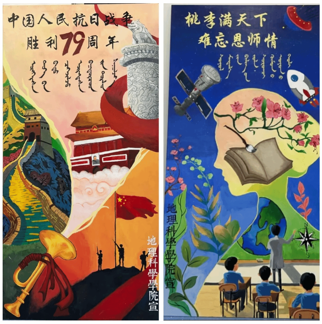 军训期间,贝博官网军事技能训练板报小组用画笔书写学院的风采,完成了“中国人民抗日战争胜利79周年”与“桃李满天下,难忘恩师情”俩幅作品,以表达抗日战争胜利的民族自豪感和对教师的敬佩之情。