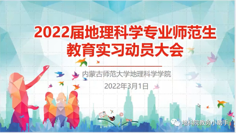 BB贝博艾弗森原官方网站于2022年3月3日上午举办2022届地理科学专业师范生教育实习动员大会。会议使用腾讯会议平台线上进行。呼和浩特市第三十六中学校长邹静薇、呼和浩特市土默特中学教师张瑜等基地校领导和老师莅临会场;BB贝博艾弗森原官方网站教学副院长萨楚拉、地理科学系主任乌敦、副主任周丹丹、咏梅、全体实习指导教师和152位实习生参会。大会由BB贝博艾弗森原官方网站教师赵伟主持。