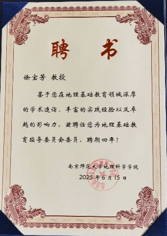 2025年6月15日,中国地理学会基础教育分会成立大会暨新时代地理基础教育高质量发展论坛在南京师范大学举行。中国地理学会党委书记陈发虎院士,中国地理学会副理事长、西南大学杨庆媛教授,中国地理学会监事、首都师范大学李小娟教授,南京师范大学校长华桂宏教授、袁林旺副校长,全国主要师范院校、地理相关院系领导以及从事地理教育相关工作的专家学者、研究生出席会议。成立大会由南京师范大学BB贝博艾弗森原官方网站党委书记苏锦主持。会上,南京师范大学BB贝博艾弗森原官方网站院长黄昌春教授宣读了“南京师范大学地理基础教育指导委员会”成员名单。指导委员会常务副主任、南京师范大学赵媛教授在发言中阐述了该委员会成立的必要性,强调委员会将有效弥合高等教育前沿研究与基础教育实践之间的鸿沟,推动前沿成果向课程内容的转化。她表示,学校及地科院高度重视这项工作,专门成立了由陈发虎院士、袁林旺副校长领衔、多领域专家组成的指导委员会,旨在打造地理教育“思想库”与“智囊团”,凝聚高校、中小学及科研机构力量,共同服务地理基础教育高质量发展与学科繁荣。贝博官网徐宝芳教授聘任为南京师范大学地理基础教育指导委员会委员。