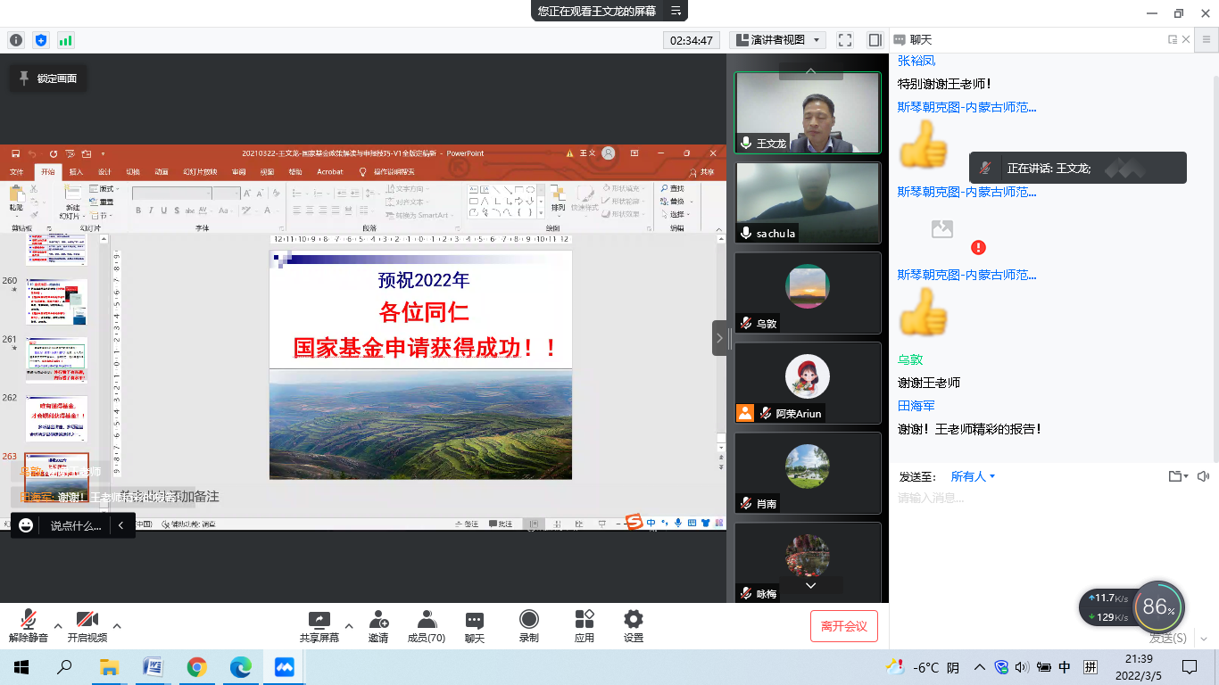 2022年3月5日,BB贝博艾弗森原官方网站邀请了中国科学院水利部水土保持研究所王文龙研究员,为贝博官网教师分享国家自然科学基金政策的新变化以及申请书的撰写技巧。讲座采用腾讯会议方式进行,由副院长萨楚拉老师主持,书记张裕凤、院长包玉海及近70名老师和博士研究生听取了报告。
