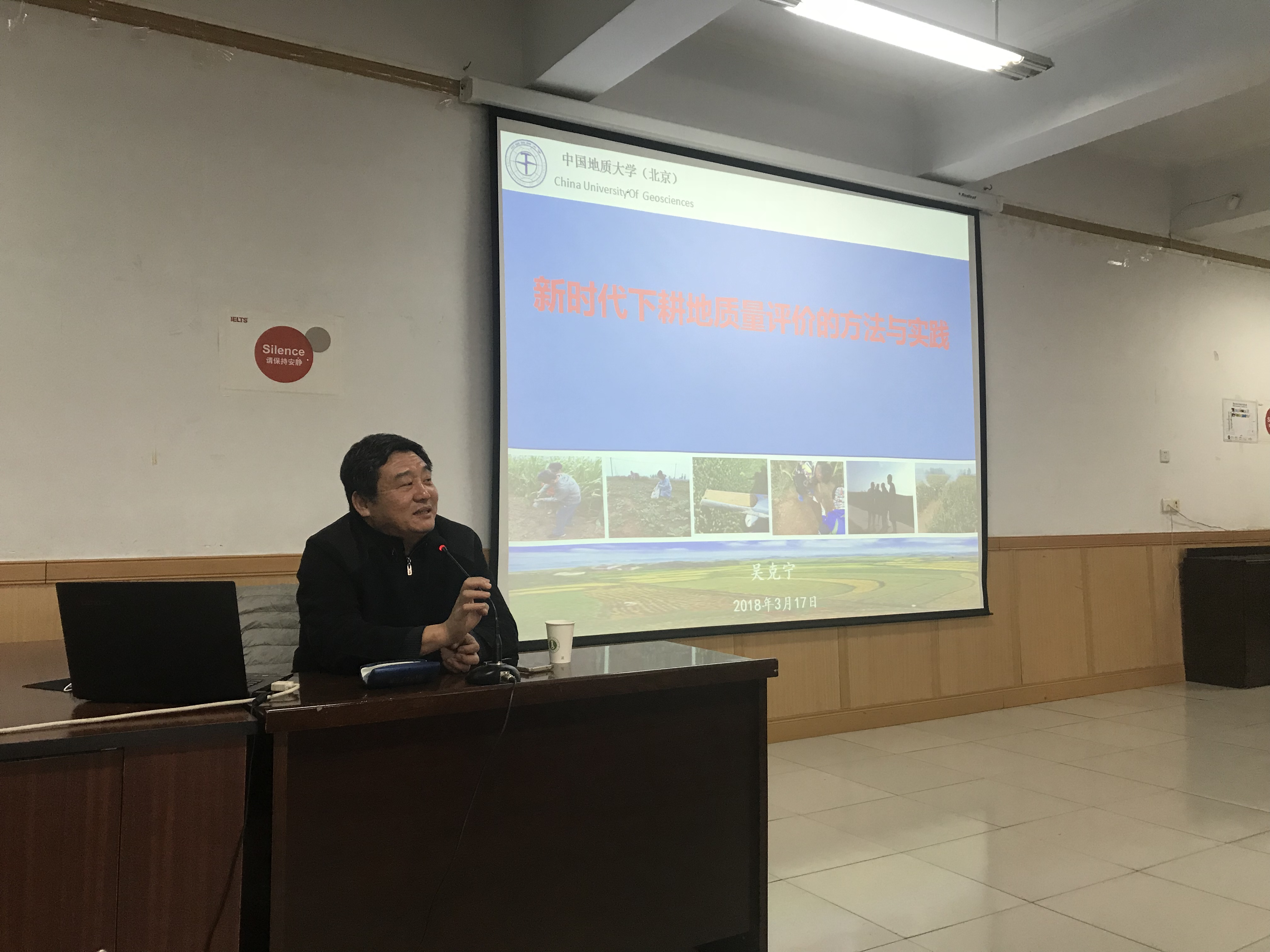 应BB贝博艾弗森原官方网站邀请,中国地质大学土地科学技术学院教授、中国土地学会常务理事、学术工作委员会副主任、中国土壤学会常务理事、土壤发生分类与土壤地理专业委员会副主任,北京市土壤学会副理事长、教育部公共管理教学指导委员会土地资源管理分委员会副主任吴克宁于2018年3月17日下午在文史楼1号会议室,做了题为《新时代下耕地质量评价的方法与实践》的学术报告。BB贝博艾弗森原官方网站副院长张裕凤教授主持讲座,学院部分老师和全体二、三年级研究生同学聆听了讲座。吴克宁教授详细讲授我国的耕地质量评价概况、耕地占补平衡管理总体形势、耕地质量综合评价与产能核算和对当前第三次土地调查关于耕地调查评价的建议,并与老师和研究生同学们就土地质量评价和当下相关土地政策等内容进行互动交流。通过此次学术报告,老师和同学们对耕地质量的评价方法、产能核算、占补平衡政策等内容有了深刻的认识。