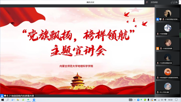 为充分发挥研究生优秀学子起到示范性引领作用,鼓励广大研究生学习党的优秀思想、弘扬党的精神、笃学慎思、锐意进取、营造敢于探索、勇于创新的学术氛围,2022年5月29日晚19:00,BB贝博艾弗森原官方网站研究生第一、二党支部、研究生会以线上腾讯会议形式举办了“党旗飘扬,榜样领航”为主题的宣讲会。参与本次会议的有地理科学学院党委书记张裕凤教授、高苏日固嘎老师及研一研二和博一博二全体同学。
