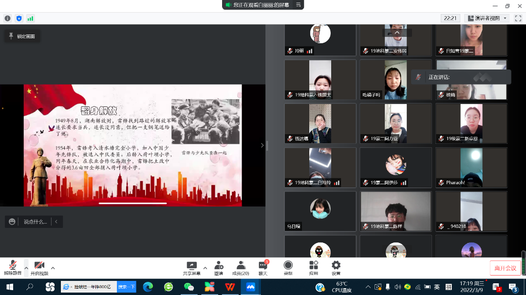为促进同学们思想进步、境界提升、行动自觉,BB贝博艾弗森原官方网站各团支部组织团支部全体同学于2022年3月初开展了“学雷锋”主题云团日活动,讲述雷锋故事,分享雷锋精神,探讨对新时代雷锋精神的理解和感悟,深化对志愿服务活动的理解与认同。