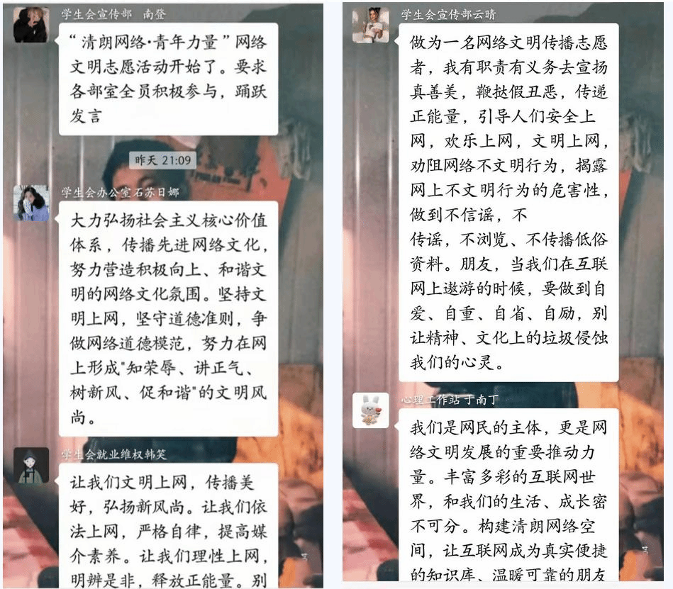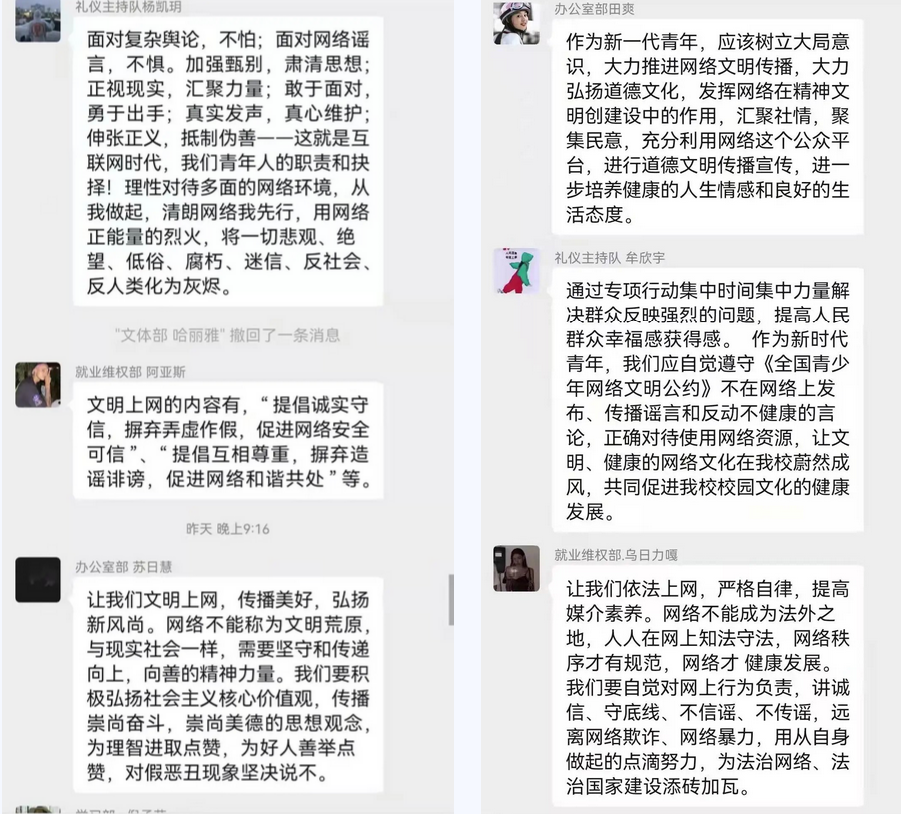 为进一步培育和践行社会主义核心价值观,切实维护国家意识形态安全,动员广大青年积极参与构建网络安全空间,2022年3月4日21:00贝博官网志愿者服务总组织队各部室成员开展“清朗网络,青年力量”活动。通过微信参与有关网络文明话题讨论,引导同学们规范网络语言、举报不良信息、抵制网络谣言,帮助学生树立正确的网络观念,文明上网。